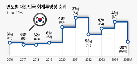 ÀÌ °°Àº ÁÖÀåÀº À±¼®¿­ Á¤ºÎ ¶§¿´´ø ȸ°è±ÔÁ¦ ¿ÏÈ­ Á¤Ã¥À¸·Î Çѱ¹ÀÇ È¸°èÅõ¸í¼º ±¹Á¦ ¼øÀ§°¡ ¶Ñ·ÇÇÑ Ç϶ô¼¼¸¦ º¸Àε¥ µû¸¥ °ÍÀÌ´Ù. ±¹Á¦°æ¿µ°³¹ß¿¬±¸¿ø(IMD)°¡ ¿ÃÇØ ¹ßÇ¥ÇÑ ±¹°¡°æÀï·Â Æò°¡¿¡¼­ Çѱ¹ÀÇ È¸°èÅõ¸í¼º ¼øÀ§´Â 69°³±¹ Áß 60À§·Î Áý°èµÆ´Ù. 2021³â 37À§±îÁö ¿Ã¶ú´ø ¼øÀ§°¡ ºÒ°ú ¼ö³â ¸¸¿¡ ÃÖÇÏÀ§±ÇÀ¸·Î ¹Ð¸° °ÍÀÌ´Ù.