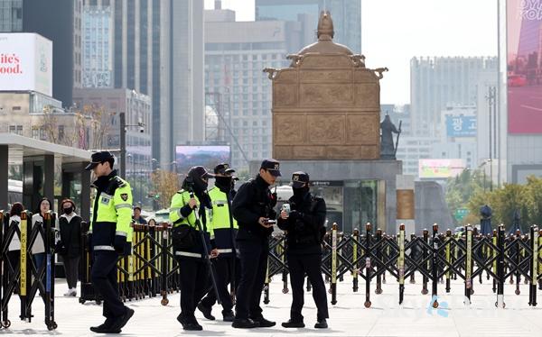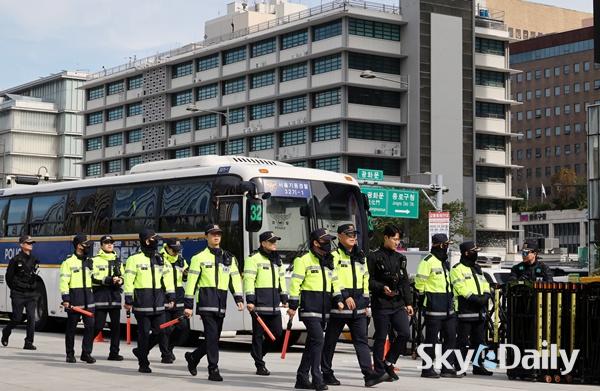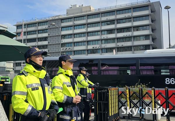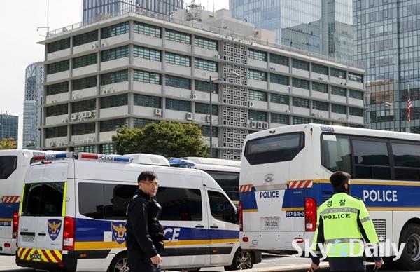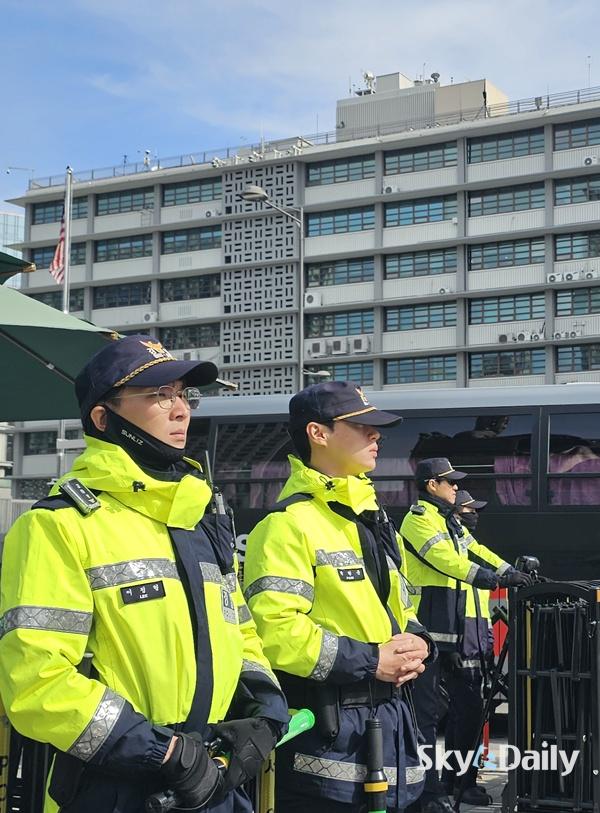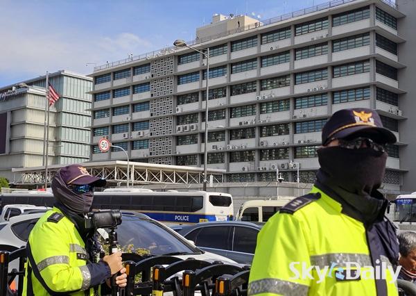 ¡ã APECÁ¤»óȸÀǸ¦ ¿Èê ¾ÕµÎ°í ÃÖ±Ù ÇÑ¡¤¹Ì°ü¼¼Çù»óÀÇ Àå±âÈ µî¿¡ µû¸¥ ¹Ý¹Ì½ÃÀ§·Î 21ÀÏ °æºñ°¡ ´ëÆø °ÈµÈ ¼¿ï Á¾·Î±¸ ÁÖÇѹ̱¹´ë»ç°ü ÁÖº¯¿¡ °æÂûµéÀÌ °æ°è±Ù¹«¸¦ ¼°í ÀÖ´Ù. °æÂûÀº ´ÙÀ½ ÁÖºÎÅÍ ÇØ´ç °æÂûû¿¡ ¡®°©È£ ºñ»ó¡¯À» ³»¸®°í, ÇÏ·ç ÃÖ´ë ¸¸ 8õ¿© ¸íÀ» µ¿¿øÇØ °æºñ ÀÛÀü¿¡ ³ª¼±â·Î Çß´Ù. ÀÌÁ¾¿ø ±âÀÚ ¨Ï½ºÄ«À̵¥Àϸ®