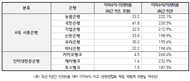 ¹Ú¹ü°è ´õºÒ¾î¹ÎÁÖ´ç ÀÇ¿ø(±¹È¸ Á¤¹«À§¿øÈ¸)ÀÌ 21ÀÏ ÀºÇ࿬ÇÕȸ·ÎºÎÅÍ Á¦Ãâ¹ÞÀº ÀÚ·á¿¡ µû¸£¸é, ÃÖ±Ù 5³â°£ (2020~2024³â) ±¹³»ÀºÇà ÀüüÀÇ ÀÌÀÚÂ÷ÀÍ(ÀÌÀÚ¼öÀÍ-ÀÌÀÚºñ¿ë)Àº 261Á¶ 6õ¾ï ¿ø¿¡ ´ÞÇß´Ù.
