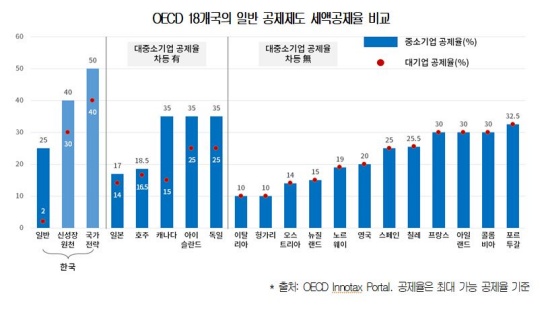 23ÀÏ ´ëÇÑ»ó°øÈ¸ÀǼҰ¡ OECD INNOTAX Æ÷Åп¡ µîÀçµÈ 33°³±¹ÀÇ ¡®R&D ¼¼Á¦Áö¿øÁ¦µµ¡¯¸¦ ºñ±³¡¤ºÐ¼®ÇÑ °á°ú, ´ë¡¤Áß¼Ò±â¾÷ °£ °øÁ¦À² Â÷µîÀ» µÎ´Â ±¹°¡´Â Çѱ¹À» Æ÷ÇÔÇØ 6°³±¹¿¡ ºÒ°úÇß´Ù. ¹Ì±¹¡¤¿µ±¹¡¤ÇÁ¶û½º µî 27°³±¹Àº µ¿ÀÏÇÑ °øÁ¦À²À» Àû¿ëÇϰí ÀÖ¾ú´Ù.