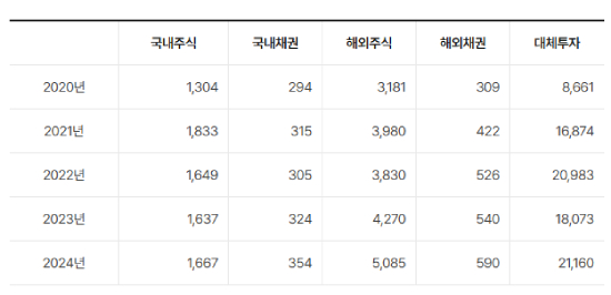 2023³âÀº ±¹³» Áֽġ¤Ã¤±Ç 1961¾ï ¿ø, ÇØ¿Ü Áֽġ¤Ã¤±Ç 4810¾ï ¿ø, ´ëüÅõÀÚ 1Á¶8073¾ï ¿øÀÌ´Ù. 2024³âÀº ±¹³» Áֽġ¤Ã¤±Ç 2021¾ï ¿ø, ÇØ¿Ü Áֽġ¤Ã¤±Ç 5675¾ï ¿ø, ´ëüÅõÀÚ 2Á¶1160¾ï ¿øÀÌ´Ù. Àü¹ÝÀûÀ¸·Î ±¹³»¿Ü Áֽİú ä±Çº¸´Ù ´ëüÅõÀÚ ºÐ¾ß¿¡¼ ¼ö¼ö·á Áõ°¡°¡ µÎµå·¯Á³´Ù.
