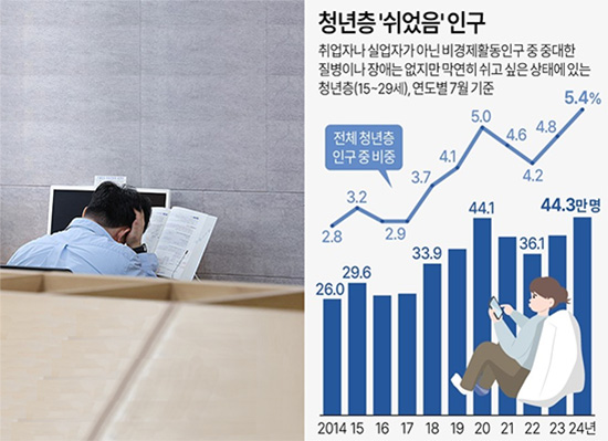 ¡ã ¡®½¬¾úÀ½¡¯ Àα¸°¡ ´Ã¾î°¡´Â °¡¿îµ¥ Ãë¾÷ Áغñ¿¡ ¿­ÁßÇϰí Àִ û³âÀÇ ¸ð½À(¿ÞÂÊ)°ú û³âÃþ ¡®½¬¾úÀ½¡¯ Àα¸ ÃßÀÌ. [ÀÚ·á=Åë°èû. ¿¬ÇÕ´º½º]
