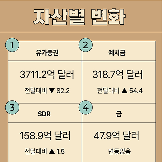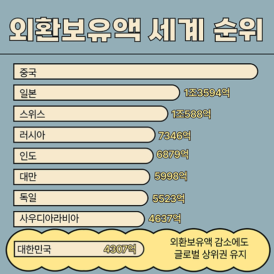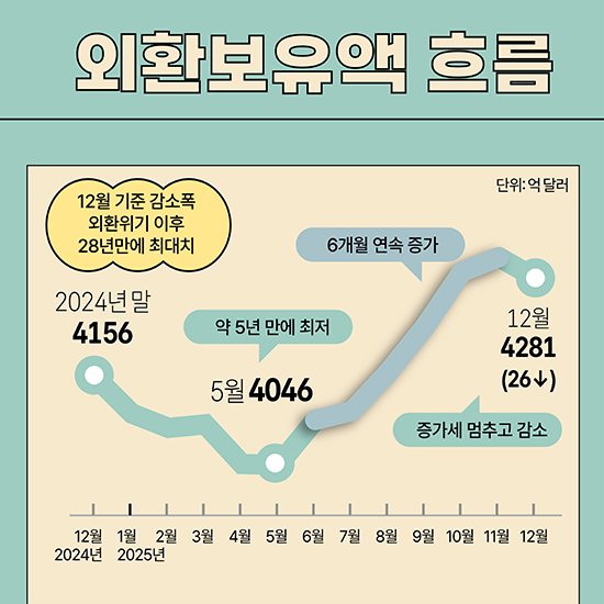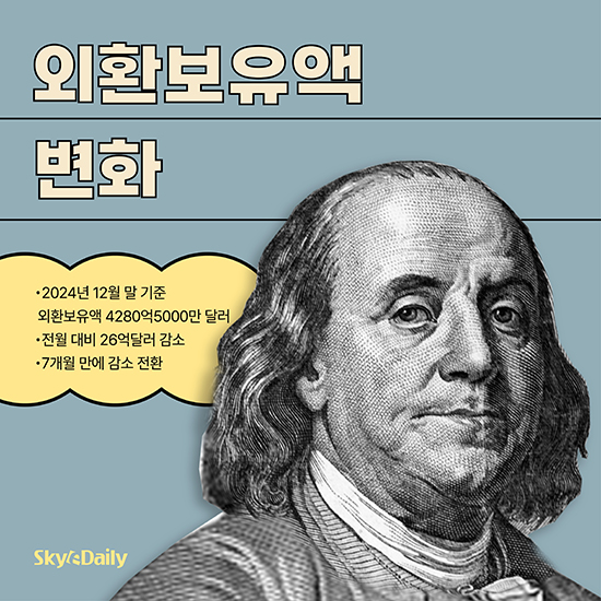 Áö³­ÇØ ¸» ¿ì¸®³ª¶ó ¿Üȯº¸À¯¾×ÀÌ È¯À² º¯µ¿¼º ¿ÏÈ­ Á¶Ä¡ µîÀÇ ¿µÇâÀ¸·Î 7°³¿ù ¸¸¿¡ °¨¼ÒÇß´Ù. Çѱ¹ÀºÇà¿¡ µû¸£¸é 2024³â 12¿ù ¸» ±âÁØ ¿Üȯº¸À¯¾×Àº 4,280¾ï5õ¸¸´Þ·¯·Î Àü¿ùº¸´Ù 26¾ï´Þ·¯ ÁÙ¾ú´Ù. 5¿ù ¸» ¾à 5³â ¸¸¿¡ ÃÖÀú ¼öÁØÀ» ±â·ÏÇÑ µÚ 11¿ù±îÁö Áõ°¡¼¼¸¦ À̾î¿ÔÁö¸¸, ¿Üȯ½ÃÀå ¾ÈÁ¤ ´ëÀÀ °úÁ¤¿¡¼­ °¨¼Ò ÀüȯÇß´Ù. Àڻ꺰·Î´Â À¯°¡Áõ±ÇÀÌ ÁÙ¾ú°í ¿¹Ä¡±Ý°ú IMF Ưº°ÀÎÃâ±ÇÀº ´Ã¾ú´Ù. Çѱ¹ÀÇ ¿Üȯº¸À¯¾× ±Ô¸ð´Â ¼¼°è 9À§ ¼öÁØÀ» À¯ÁöÇß´Ù.