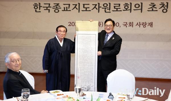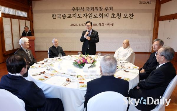 ¡ã ¿ì¿ø½Ä(¾ÕÁÙ ¿ÞÂÊ ³× ¹øÂ°) ±¹È¸ÀÇÀåÀÌ 6ÀÏ ¼­¿ï ¿©Àǵµ ±¹È¸ »ç¶ûÀç¿¡¼­ ¿­¸° Çѱ¹Á¾±³ÁöµµÀÚ¿ø·ÎȸÀÇ ÃÊû ¿ÀÂù °£´ãȸ¿¡¼­ Âü¼®ÀÚµé°ú ±â³äÃÔ¿µÇϰí ÀÖ´Ù. ¿ì ÀÇÀåÀº À̳¯ °£´ãȸ¿¡¼­ ¡°±¹¹ÎÀ» ¹Ï°í »çȸ¸¦ ¾ÈÁ¤½ÃŰ´Â µ¥ ±¹È¸°¡ ÃÖ¼±ÀÇ ¿ªÇÒÀ» ´ÙÇÒ ¼ö ÀÖµµ·Ï ³ë·ÂÇϰڴ١±°í Çß´Ù. ¹Ú¹Ì³ª ±âÀÚ ¨Ï½ºÄ«À̵¥Àϸ®