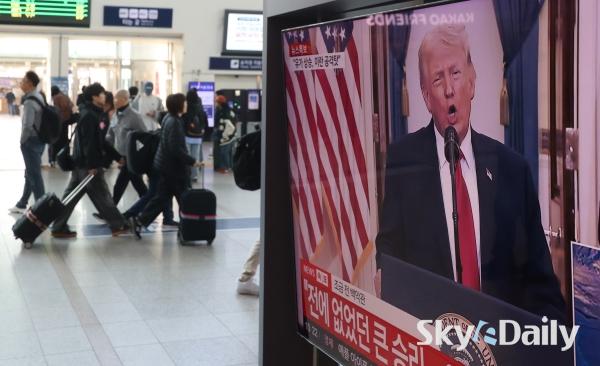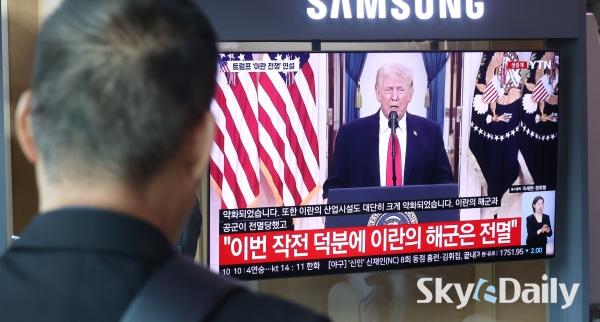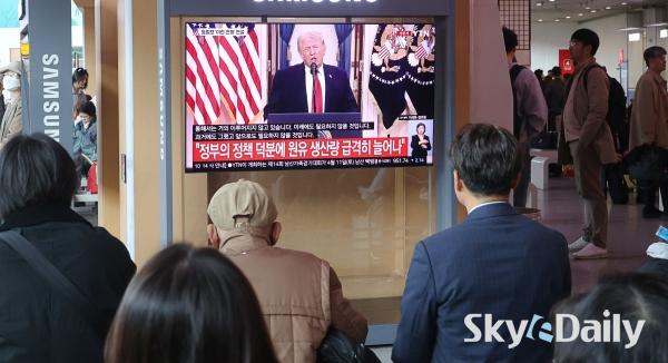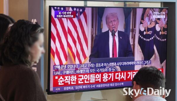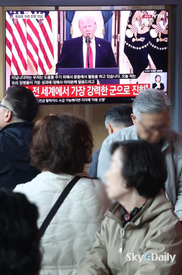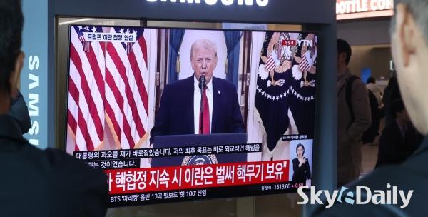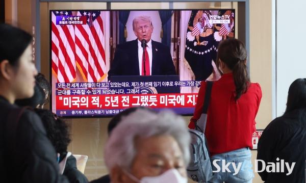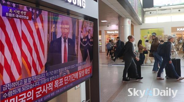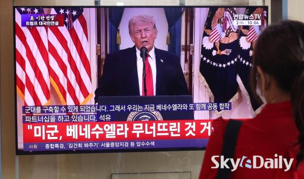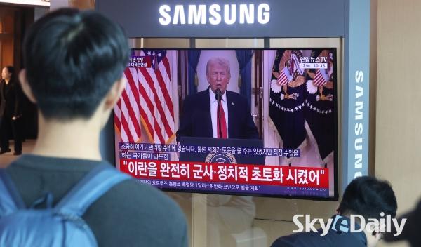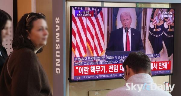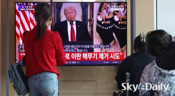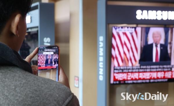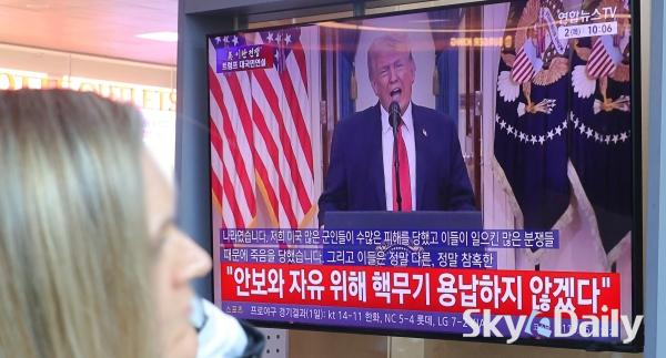 ¡ã 2ÀÏ ¿ÀÀü ¼­¿ï½Ã ¿ë»ê±¸ ¼­¿ï¿ª ´ëÇսǿ¡¼­ ½Ã¹ÎµéÀÌ µµ³Îµå Æ®·³ÇÁ ¹Ì±¹ ´ëÅë·ÉÀÇ À̶õ ÀüÀï »óȲ °ü·Ã ´ë±¹¹Î ¿¬¼³ TV »ýÁ߰踦 ÁöÄѺ¸°í ÀÖ´Ù. ¹Ú¹Ì³ª ±âÀÚ ¨Ï½ºÄ«À̵¥Àϸ®