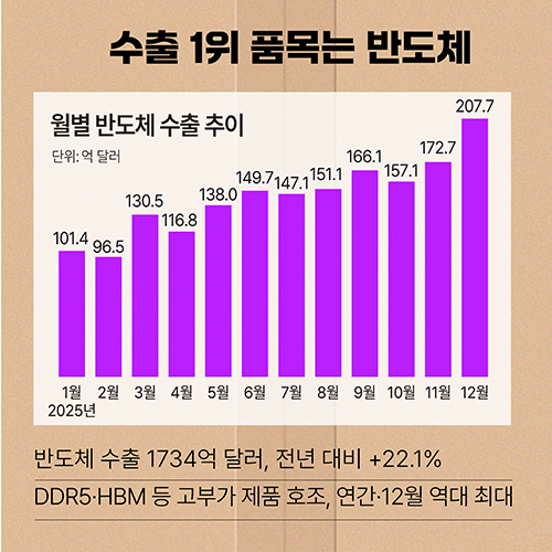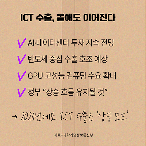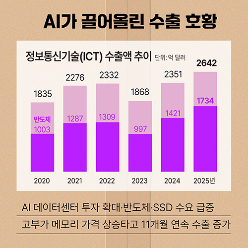 »ê¾÷Åë»óÀÚ¿øºÎ¿Í °úÇбâ¼úÁ¤º¸Åë½ÅºÎ´Â 14ÀÏ ¡®2025³â ¿¬°£ ¹× 12¿ù ICT ¼öÃâÀÔ µ¿Ç⡯À» ¹ßÇ¥Çß´Ù. Áö³ÇØ ICT ¼öÃâÀº 2642¾ï9000¸¸ ´Þ·¯·Î Àü³â ´ëºñ 12.4% Áõ°¡ÇÏ¸ç ¿ª´ë ÃÖ´ëÄ¡¸¦ ±â·ÏÇß´Ù. ¼öÀÔÀº 1512¾ï5000¸¸ ´Þ·¯·Î 5.8% ´Ã¾ú°í, ¹«¿ª¼öÁö´Â 1130¾ï4000¸¸ ´Þ·¯ ÈæÀÚ¸¦ ³ªÅ¸³Â´Ù. AI µ¥ÀÌÅͼ¾ÅÍ ÅõÀÚ È®´ë¿¡ µû¸¥ ¹ÝµµÃ¼¿Í SSD ¼ö¿ä ±ÞÁõÀÌ ¼öÃâ È£Á¶¸¦ À̲ø¾ú´Ù. ƯÈ÷ ¹ÝµµÃ¼ ¼öÃâÀº 1734¾ï8000¸¸ ´Þ·¯·Î 22.1% Áõ°¡Çß´Ù. 12¿ù ¼öÃâµµ ¿ù°£ óÀ½À¸·Î 300¾ï ´Þ·¯¸¦ µ¹ÆÄÇϸç Áõ°¡¼¼¸¦ À̾´Ù.