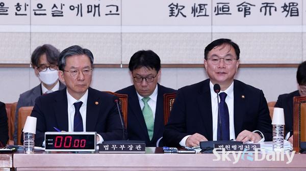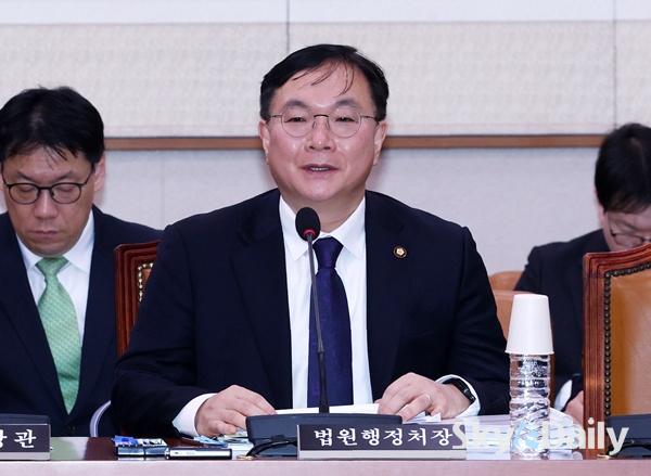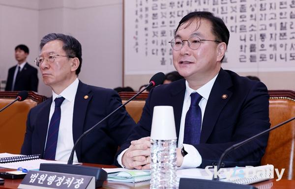 ¡ã ¹Ú¿µÀç ¹ý¿øÇàÁ¤Ã³ÀåÀÌ 4ÀÏ ±¹È¸¿¡¼­ ¿­¸° ¹ýÁ¦»ç¹ýÀ§¿øÈ¸ ÀüüȸÀÇ¿¡¼­ ÀÇ¿ø ÁúÀÇ¿¡ ´äº¯Çϰí ÀÖ´Ù. ¹Ú¿µÀç ½ÅÀÓ ¹ý¿øÇàÁ¤Ã³Àå(´ë¹ý°ü)Àº ¹ý¿ø ÀçÆÇ¿¡ ´ëÇÑ Çå¹ý¼Ò¿øÀ» Çã¿ëÇÏ´Â ¡®ÀçÆÇ¼Ò¿ø¡¯ Á¦µµ¸¦ µÎ°í ¡°4½ÉÁ¦·Î °¡´Â ±æÀÌ°í ±¹¹ÎµéÀ» ¼Ò¼ÛÁö¿Á¿¡ ºü¶ß¸®°Ô ÇÏ´Â °Í¡±À̶ó°í ¸»Çß´Ù. Áö³­´Þ õ´ë¿± ÀüÀÓ Ã³Àå ÈÄÀÓÀ¸·Î ÀÓ¸íµÈ ¹Ú óÀåÀÌ ±¹È¸ ¹ý»çÀ§¿¡ Ãâ¼®ÇØ °ü·Ã ÀÔÀåÀ» ¹àÈù °ÍÀº À̹øÀÌ Ã³À½ÀÌ´Ù. ÀÌÁ¾¿ø ±âÀÚ ¨Ï½ºÄ«À̵¥Àϸ®