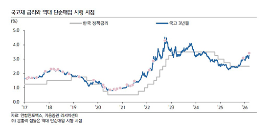 À̹ø Á¶Ä¡ ¿ª½Ã ±âÁرݸ®°¡ µ¿°áµÈ »óȲ¿¡¼ ÇöÀç ½ÃÀå±Ý¸® ¼öÁØÀÌ °úµµÇÏ´Ù´Â ÀÎ½Ä ¾Æ·¡ ³ª¿Â ´ëÀÀÀ¸·Î ÀÐÈù´Ù. ÀÌ ¶§¹®¿¡ ½ÃÀå ¾ÈÆÆ¿¡¼´Â ´Ü¹ß¼º Á¶Ä¡¿¡ ±×Ä¡Áö ¾Ê°í Ãß°¡ ´Ü¼ø¸ÅÀÔÀÌ À̾îÁú °¡´É¼ºµµ ÇÔ²² °Å·ÐÇÑ´Ù. ½ÇÁ¦·Î °ú°Å È帧À» º¸¸é ´Ü¼ø¸ÅÀÔ ÀÌÀü±îÁö »ó½ÂÇÏ´ø ±¹°í 3³â¹° ±Ý¸®°¡ ¸ÅÀÔ ÀÌÈÄ¿¡´Â º¸Çձǿ¡¼ ¿òÁ÷ÀÌ¸ç »ó½Â¼¼°¡ Á¦¾àµÈ »ç·Ê°¡ ÀûÁö ¾Ê¾Ò´Ù.