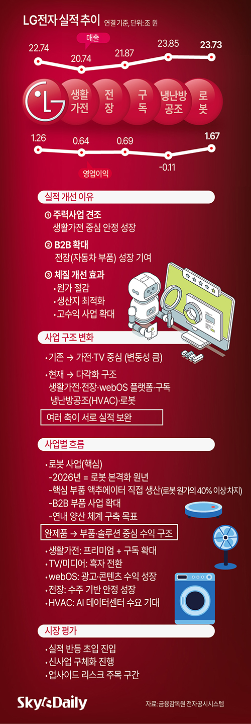 LGÀüÀÚ°¡ ¿ÃÇØ 1ºÐ±â ¸ÅÃâ 23Á¶7330¾ï¿ø, ¿µ¾÷ÀÌÀÍ 1Á¶6736¾ï¿øÀÇ ÀáÁ¤ ½ÇÀûÀ» ±â·ÏÇÏ¸ç ½ÃÀå ±â´ë¸¦ ¿ôµ¹¾Ò´Ù. ¸ÅÃâÀº 1ºÐ±â ±âÁØ ÃÖ´ë, ¿µ¾÷ÀÌÀÍÀº 32.9% Áõ°¡Çß´Ù. »ýȰ°¡Àü Áß½ÉÀÇ ¾ÈÁ¤Àû ¼ºÀå¿¡ ÀüÀå µî B2B »ç¾÷ È®´ë¿Í ¿ø°¡ ±¸Á¶ °³¼± È¿°ú°¡ ´õÇØÁø °á°ú´Ù. ·Îº¿¡¤AI µ¥ÀÌÅͼ¾ÅÍ ³Ã°¢ µî ½Å»ç¾÷µµ ±¸Ã¼È­µÇ¸ç ½ÇÀû ¹Ýµî ±â´ë°¡ Ä¿Áö°í ÀÖ´Ù.