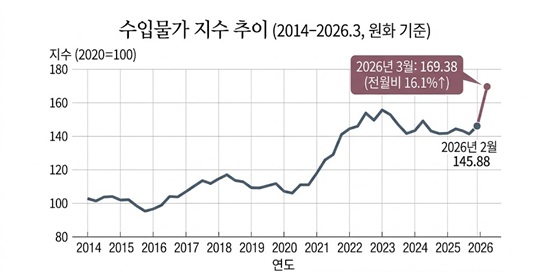 Çѱ¹ÀºÇàÀº 15ÀÏ ¹ßÇ¥ÇÑ 3¿ù ¼öÃâÀÔ¹°°¡Áö¼ö ¹× ¹«¿ªÁö¼ö(ÀáÁ¤)¿¡ µû¸£¸é ¼öÀÔ¹°°¡Áö¼ö´Â 169.38·Î Àü¿ù(145.88)´ëºñ 16.1% »ó½ÂÇß´Ù. Àü³âµ¿¿ù´ëºñ·Îµµ 18.4% ¿Ã¶ú´Ù. ±âÁØ¿¬µµ 2020³âÀ» 100À¸·Î ³õÀº ¿øÈ ±âÁØ Áö¼ö´Ù.