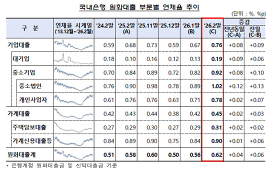 ºÎ¹®º°·Î º¸¸é ±â¾÷´ëÃâÀÌ Àüü ¿¬Ã¼À² »ó½ÂÀ» À̲ø¾ú´Ù. 2¿ù ¸» ±â¾÷´ëÃâ ¿¬Ã¼À²Àº 0.76%·Î Àü¿ù ¸» 0.67%º¸´Ù 0.09%p ¿Ã¶ú´Ù. ÀÌ °¡¿îµ¥ ´ë±â¾÷´ëÃâ ¿¬Ã¼À²Àº 0.19%·Î 0.06%p, Áß¼Ò±â¾÷´ëÃâ ¿¬Ã¼À²Àº 0.92%·Î 0.10%p »ó½ÂÇß´Ù. ƯÈ÷ Áß¼Ò¹ýÀÎ ¿¬Ã¼À²Àº 1.02%·Î Àü¿ùº¸´Ù 0.13%p ¿Ã¶ó ÁÖ¿ä ¼¼ºÎ Ç׸ñ °¡¿îµ¥ °¡Àå ³ôÀº ¼öÁØÀ» ±â·ÏÇß´Ù. °³Àλç¾÷ÀÚ´ëÃâ ¿¬Ã¼À²µµ 0.78%·Î 0.07%p »ó½ÂÇß´Ù.